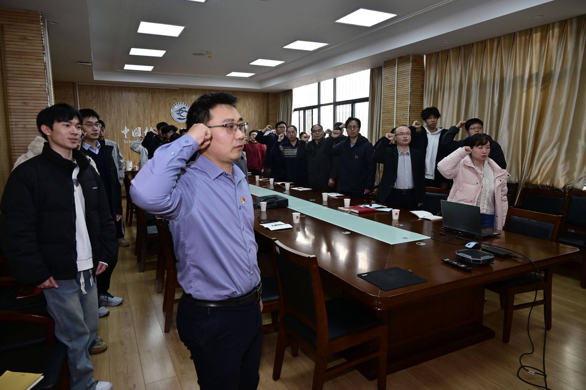 全体党员在汪再奇的领誓下,面向党旗庄严宣誓,重温入党誓词。