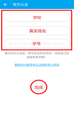 三、 选择校方认证,输入学校、真实姓名、学号、点击完成注册